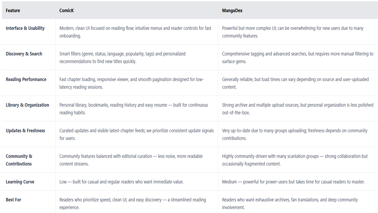ComicK stood out for its commitment to usability, outshining competitors like MangaDex. While MangaDex offered vast, community-driven archives, its complex interface and variable load times could overwhelm newcomers. ComicK, by contrast, delivered a sleek, intuitive UI with smarter discovery tools, faster chapter loading, and curated updates, making it ideal for readers prioritizing speed and simplicity. Its community features struck a balance, vibrant yet focused, fostering engagement through active Discord, Reddit (r/ComicK), and Facebook groups where fans swapped recommendations, debated stories, and shaped the platform’s evolution.